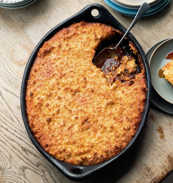 - If you are making the corn topping, spoon the chicken into a ceramic baking dish – one with high sides that measures about 20 x 30cm – and set aside.